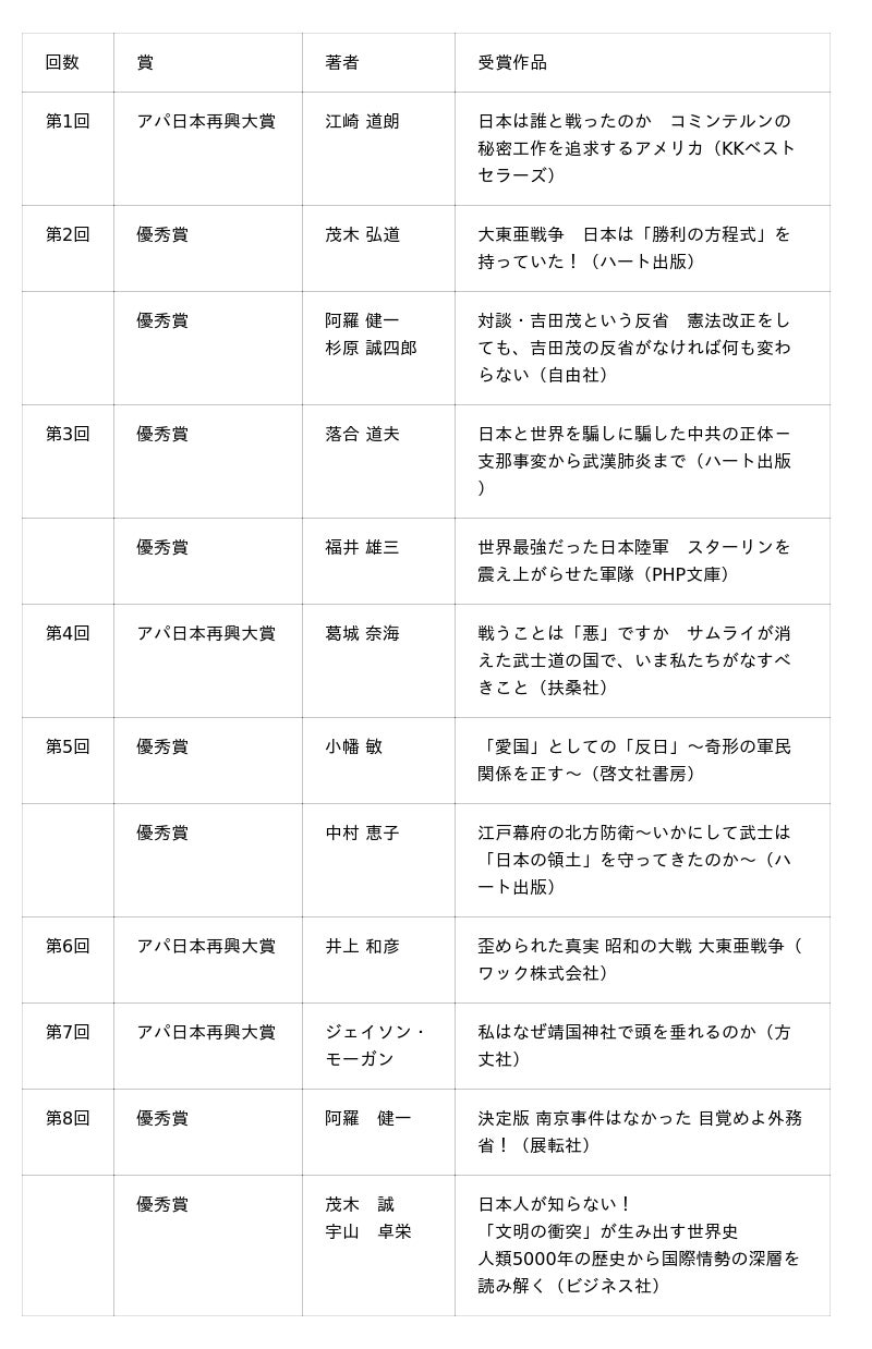「アパ日本再興大賞」表彰制度は、過去5年以内に発刊された書籍や発表された論文のうち、推薦人による推薦を受けた作品の中から、審査委員によって本大賞の趣旨に照らして最も優れた作品を選定致します。(https://ajrf.jp/taisho/index.html)
