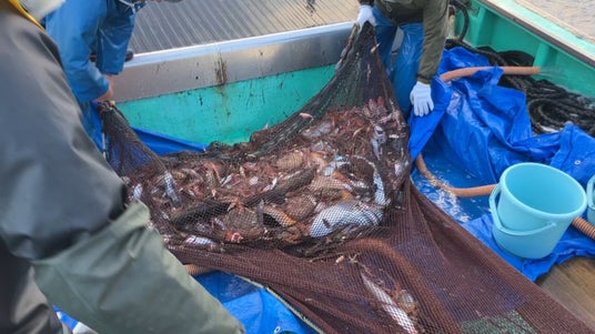 船で袋状の網をひいて海底付近に生息する生物を漁獲する漁法。サンシャイン水族館が同船させていただいている駿河湾では、アカザエビやメヒカリなどの深海生物を漁獲する底曳き網漁が盛んに行われています。