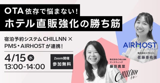 株式会社エアホスト(本社:東京都渋谷区、代表取締役:尾畠 隆志、以下「エアホスト」)は、宿泊施設向け自社予約エンジン「CHILLNN(チルン)」を提供する株式会社CHILLNN(本社:京都府京都市下京区花屋町通櫛笥西入薬園町174−9、代表取締役:永田諒、以下「チルン」)との間で、「CHILLNN」の「AirHost HMS(Hospitality Management Solution)」へのAPI連携を開始しました。