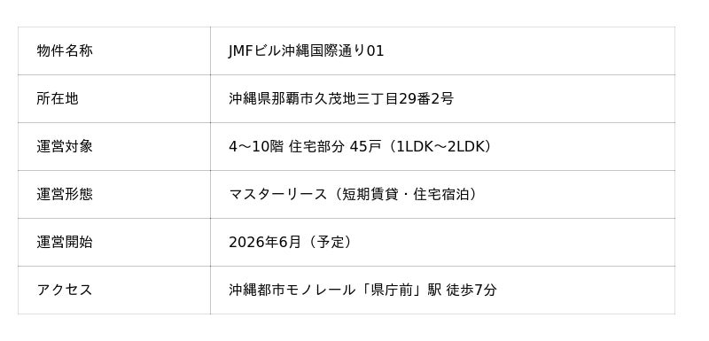 ソフトウェアを主軸に、空間の価値を最大化するソリューション「StayX」を運営するmatsuri technologies株式会社(本社:東京都新宿区、以下matsuri社)は、日本都市ファンド投資法人(コード番号:8953、以下JMF)が保有する「JMFビル沖縄国際通り01」の住宅部分(45戸)について、マスターリース契約に基づく短期賃貸・住宅宿泊での運営契約を受託したことをお知らせいたします。