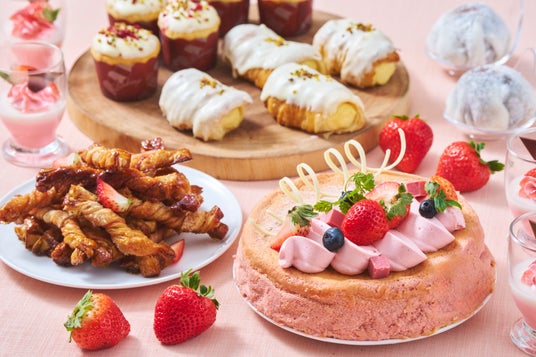 1月と4月は春をイメージした「イチゴ×Spring」、2月はイチゴとチョコレートを合わせた「イチゴ×ショコラ」、3月はやさしい色合いの「イチゴ×ホワイト」をテーマに、月毎に異なるイチゴスイーツを提供します。イチゴのショートケーキやティラミスに加え、クロワッサンやマフィン、ストロベリークリームホーンなどのパンもご用意。イチゴスイーツやパンのほか、サラダ・スープ・パスタもお楽しみいただけます。