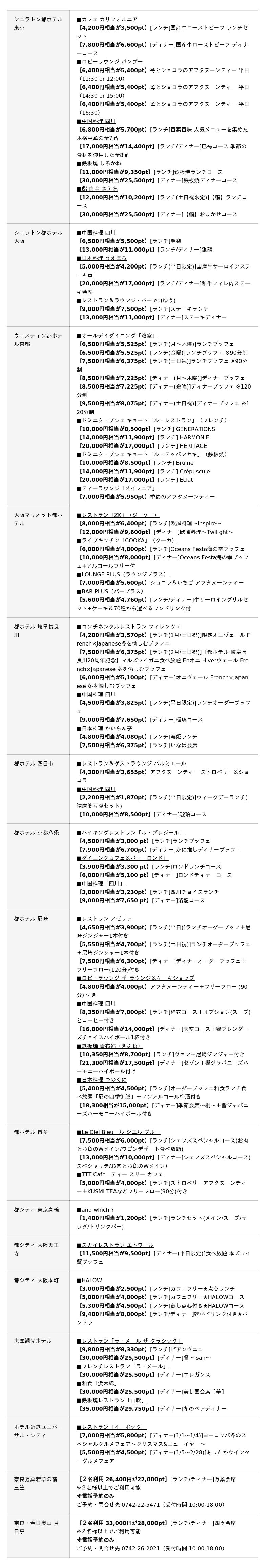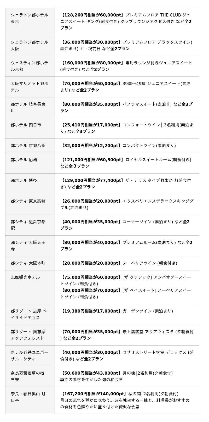 都ホテルズ&リゾーツ 国内19施設シェラトン都ホテル東京/シェラトン都ホテル大阪/ウェスティン都ホテル京都/大阪マリオット都ホテル/都ホテル 岐阜長良川/都ホテル 四日市/都ホテル 京都八条/都ホテル 尼崎/都ホテル 博多/都シティ 東京高輪/都シティ 近鉄京都駅/都シティ 大阪天王寺/都シティ 大阪本町/志摩観光ホテル/都リゾート 志摩 ベイサイドテラス/都リゾート 奥志摩 アクアフォレスト/ホテル近鉄ユニバーサル・シティ/奈良 万葉若草の宿 三笠/奈良・春日奥山 月日亭