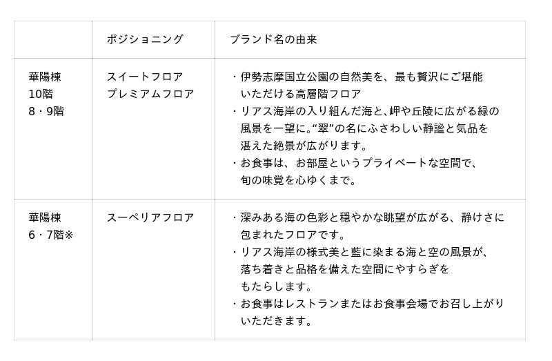 賢島宝生苑(本社:三重県志摩市/代表取締役社長:伏見 晋也)では、本年4月1日(水)から、全館の客室呼称をリブランディングします。各フロアに名称を設け、客室の位置付けを明確に区別することで、お客さまが希望に沿った客室を選択しやすくします。