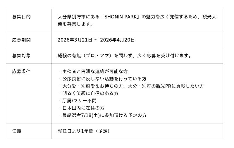 このたび実施する「SHONIN PARK 観光大使2026」は、こうした施設の魅力を多角的に発信し、別府エリアへの来訪促進および認知向上を図ることを目的としています。観光大使には、イベントへの参加や写真・動画の撮影、コメント提供などを通じて、リアルな体験をもとに情報発信を行っていただきます。SNSや各種メディアでの発信に意欲のある方、別府や大分の魅力を伝えたいという想いを持つ方からのご応募をお待ちしております。なお、応募締切は2026年4月20日を予定しております。