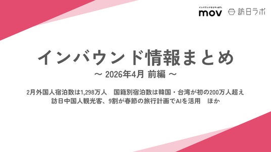 業界最大級のインバウンドビジネスメディア「訪日ラボ」及び 店舗向け集客一元化プラットフォーム「口コミコム」を運営する株式会社mov(代表取締役:渡邊 誠、本社:東京都渋谷区、以下mov)は、「インバウンドに関する最新トレンド・データ」「政府・自治体・企業などのインバウンド関連の取り組み」をはじめ、インバウンド対策に役立つニュースをまとめた「インバウンド情報まとめ【2026年4月前編】」を公開しました。
