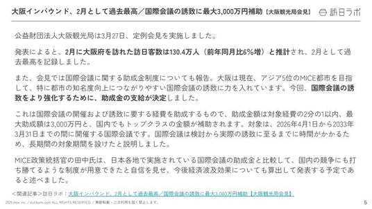- 大阪インバウンド、2月として過去最高/国際会議の誘致に最大3,000万円補助