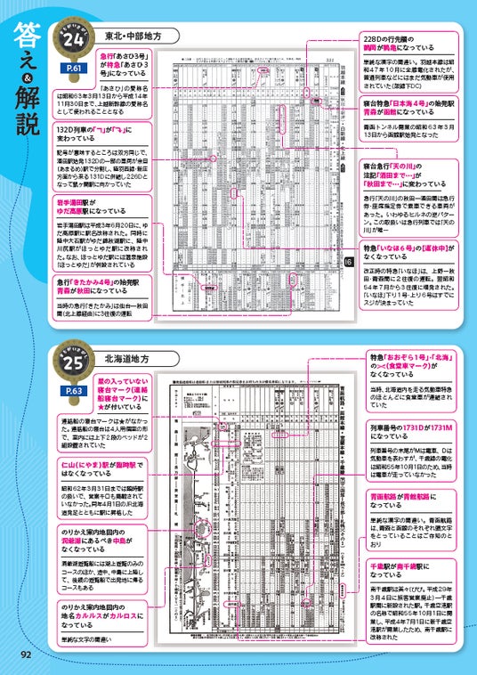 問題は、初級から上級まで幅広い難易度を用意しています。単なる間違い探しにとどまらず、時刻表ならではの“鉄道ネタ”を随所に盛り込んだ、ファン垂涎の仕掛けが満載です。さらに各ページには、当時のダイヤ改正の話題や豆知識も掲載し、読み物としても充実の内容となっています。懐かしさと新しい発見が交錯する、鉄道ファン必携の一冊です。
