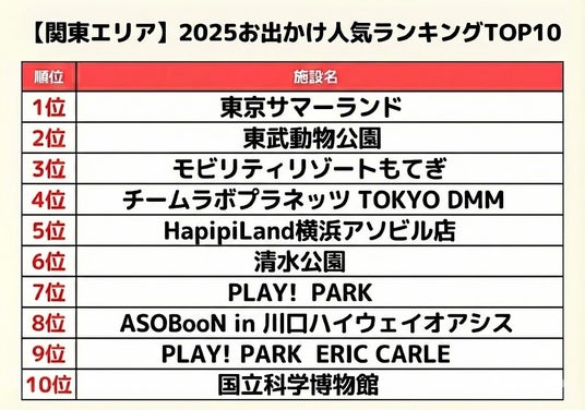 国内最大級の子どもとお出かけ情報サイト「いこーよ」(https://iko-yo.net)を企画・運営するアクトインディ株式会社(本社:東京都品川区 代表:下元敬道)では、2025年のお出かけ人気スポット年間ランキングを「いこーよ」内で発表いたしました。