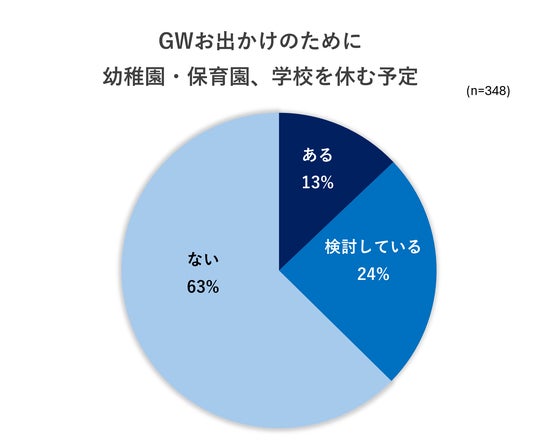 まず、GWのお出かけを予定している家庭に、GW期間の平日に学校・園を休む予定があるかを尋ねました。「ある」が13%、「検討している」が24%で、合わせると約4割の家庭がGWの平日お出かけを視野に入れていることがわかりました。