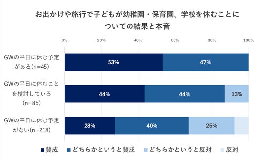 また、平日に休む予定がない層でも、「賛成」が28%、「どちらかというと賛成」が40%で、合わせて7割近くが賛成派でした。実際には休ませない家庭でも、お出かけのために休むことには否定的ではない様子がうかがえます。
