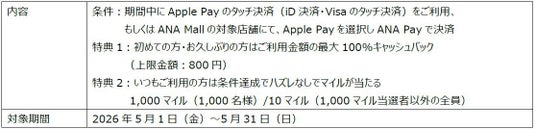 ・3周年を記念して、5月1日(金)から5月31日(日)までの期間で「ANA Payのタッチ決済おトク祭り(Apple Pay)」を開催いたします。