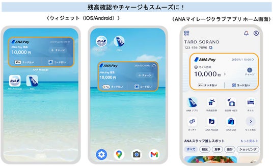 スマートフォン ホーム画面のウィジェットに対応。アプリを開かず、「もっと素早く残高を確認したい」という声に応え、スマートフォンのホーム画面から即座に残高確認やコード表示ができるウィジェット機能を搭載しました。また、ANAマイレージクラブ アプリのホーム画面からもANA Payの残高確認やチャージが直接操作可能になりました。