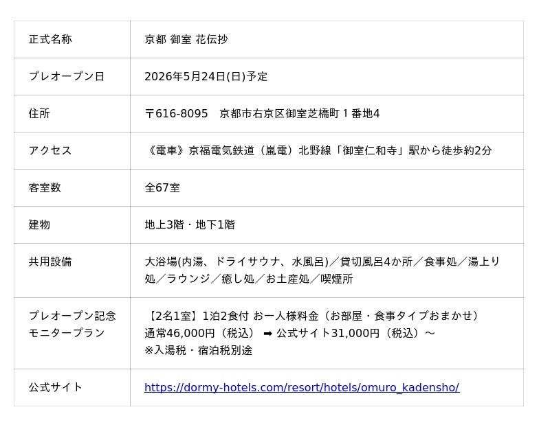 全国にリゾートホテル「共立リゾート」やビジネスホテル「ドーミーイン」を運営する株式会社共立メンテナンス(以下、共立メンテナンス/代表取締役社長:中村 幸治/本社:東京都千代田区)は、京都府京都市に2026年5月24日(日)にプレオープンするリゾートホテル『京都 御室 花伝抄』の宿泊予約受付を2026年3月3日(火)より公式サイトにて開始いたします。