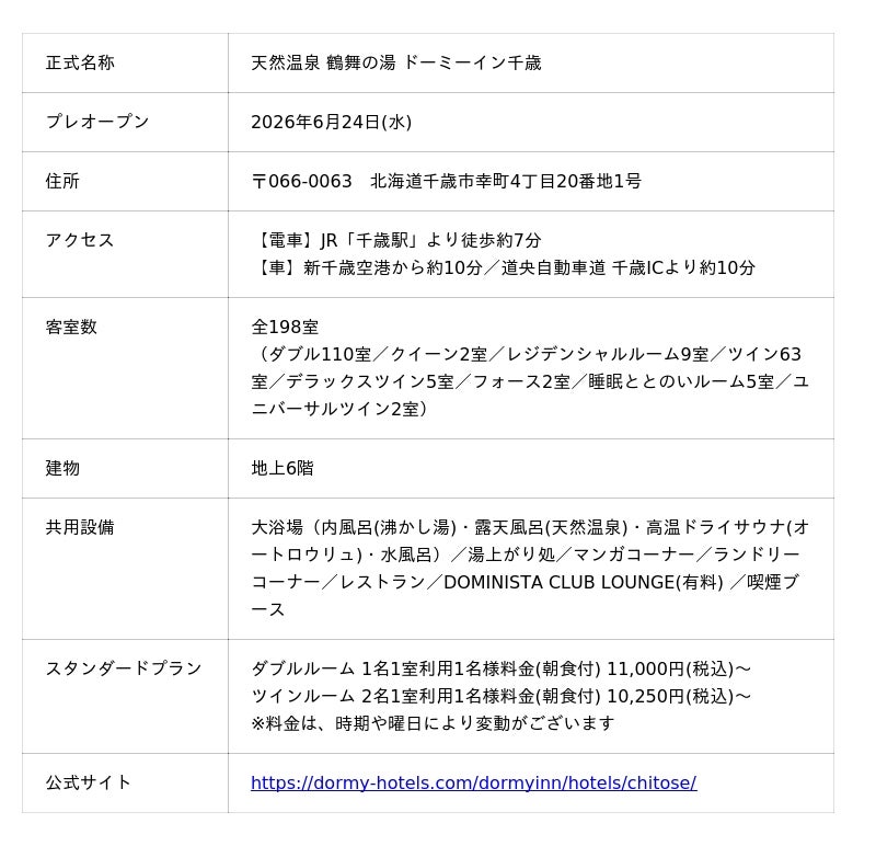 全国にビジネスホテル 「ドーミーイン」やリゾートホテル「共立リゾート」を運営する株式会社共立メンテナンス(以下、共立メンテナンス/代表取締役社長:中村 幸治/本社:東京都千代田区)は、2026年6月24日(水)にプレオープンする『天然温泉 鶴舞(つるまい)の湯 ドーミーイン千歳』の先行受付を2026年4月20日(月)より公式サイトにて開始いたしました。