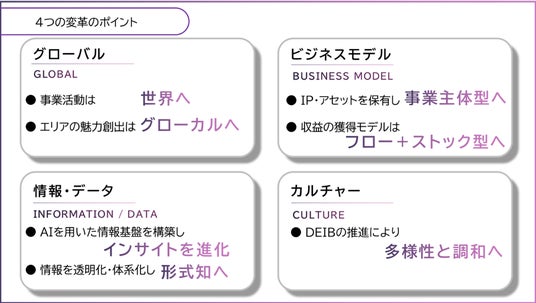 JTBグループは「新」交流時代のフロンティア企業として、創立から114年にわたり培ってきた洞察力と専門性を生かし、交流を創造する力を最大限に活用して、社会課題の解決とツーリズム産業全体の持続可能な未来の創造に貢献していきます。ありたい姿に向けた変革のポイントは4つ、 「グローバル」「ビジネスモデル」「情報・データ」「カルチャー」です。