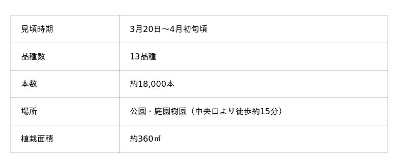 *当公園の早咲きチューリップは、春に咲くチューリップの球根を冷蔵処理してから植え付けることで、通常より早く花を咲かせるようにしているため、特別な品種が存在するものではありません。