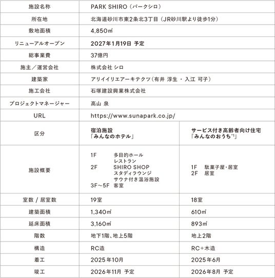 株式会社シロは、2027年1月19日(火)に砂川パークホテルの名称を『PARK SHIRO』へと変え、リニューアルオープンします。『PARK SHIRO』は宿泊施設「みんなのホテル」と、サービス付き高齢者向 け住宅「みんなのおうち*1」で構成され、ブランド初となる“セカンドハンド”をテーマとした新しいかたちのショップも併設します。「みんなのホテル」には5タイプ19室のほか、温浴施設やレストラン、多目的ホールを計画。サービス付き高齢者向け住宅「みんなのおうち*1」には、敷地内に駄菓子屋をオープンするなど、それぞれの場を開き、訪れる人にとっても、暮らす人にとっても、日常の居場所になることを目指します。