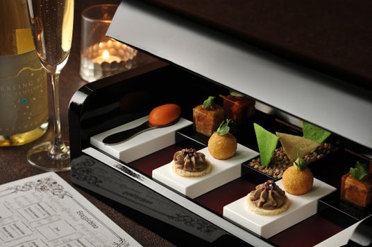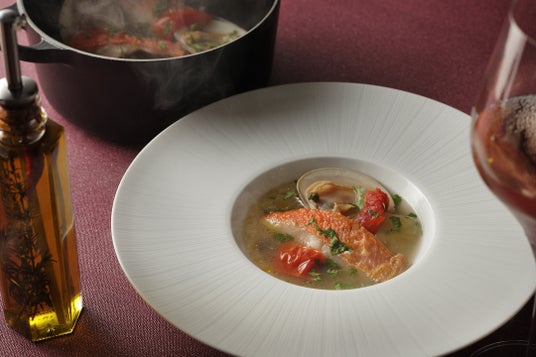 夕食は、地元信州のワインとのマリアージュを追求した本格的なイタリアンコースを提供します。信州・松本は、桔梗が原ワインバレーなどを抱える、日本ワインの主要産地です。また信州のワインは、澄んだ味わいと瑞々しい果実味が特徴です。その軽やかな余韻を消さないために、ソースで重層的に仕上げるのではなく、オリーブオイルの瑞々しさで繋ぐイタリアンで美食体験を追求することにしました。最初の一品には「ストゥッツキーニ(小前菜)」が、ピアノをモチーフにした特注の器で登場します。イタリア語で「エレガンテ」は音楽の曲想用語としても使われますが、ピアノをモチーフにした最初のストッツキーニは、まさにその言葉を象徴する一皿と言えます。