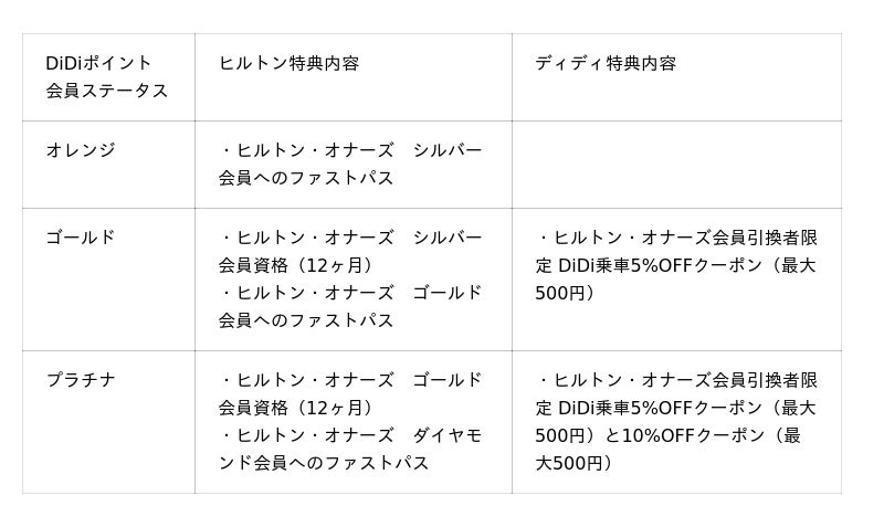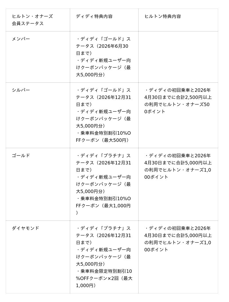 ヒルトンのゲスト・ロイヤリティ・プログラム「ヒルトン・オナーズ」の会員ステータスに応じて、ディディでの上位ステータスと限定特典を提供し、ディディ初回乗車のヒルトン・オナーズ会員にはステータスに応じてヒルトン・オナーズポイントを付与いたします。
