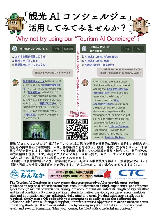R-NETは分散している複数のサイト(観光や物産、ふるさと納税)の統合に向けて「全てを一度に変えない」スモールスタート型の観光DXとして、体験を起点とした地域OTA(オンライン旅行会社)、生成AI(人工知能)を活用した観光AIコンシェルジュを段階的に導入する方針を安中市DMOとともに設計しました。CTCはその整理された戦略に基づき、システム構築からキャッシュポイントの運用支援までを担い、多言語対応の省力化、周遊促進、情報提供の高度化を実現しています。