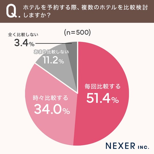 結果は、51.4%が「毎回比較する」、34.0%が「時々比較する」と回答し、合計85.4%の方が比較しながらホテルを選んでいることがわかりました。つまり、ホテル予約の際に複数候補を比較する人は8割以上にのぼるということです。