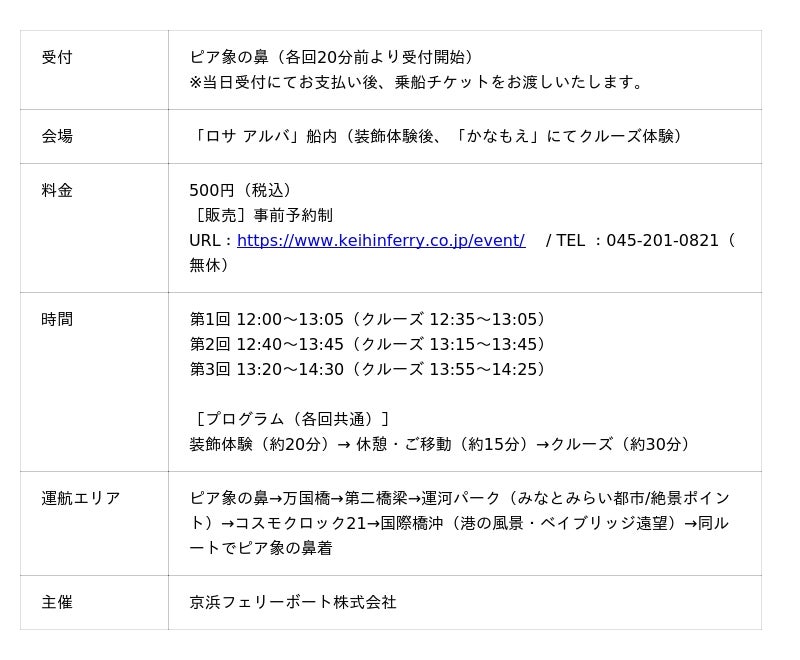 本企画は、年間を通じて横浜各所に花の体験企画を連続展開し、港まち・横浜全体を花で彩ることを目指すとともに、 「GREEN×EXPO 2027(2027年国際園芸博覧会)」に向けた機運醸成にもつなげていくものです。 今回は第1弾として、花で装飾されたクルーズ船でみなとみらいのベイエリアを巡る「フラワークルーズ」を、京浜フェリーボート株式会社と連携し実施します。