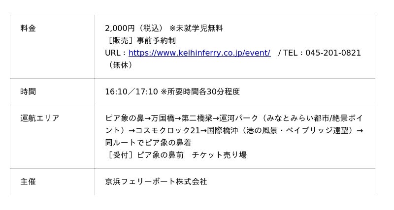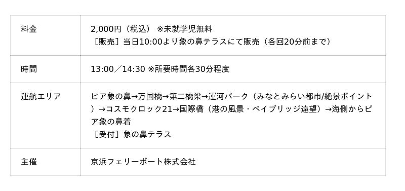 こどもの日にあわせた特別企画として、4月26日の体験イベントで制作した花装飾を施した船上から、水辺の景観と特別な体験をお楽しみいただけます。1. みなとみらい運河フラワークルーズ 象の鼻テラスコラボ -専門ガイド案内&シャボン玉とゾウノハナソフトクリーム付き-