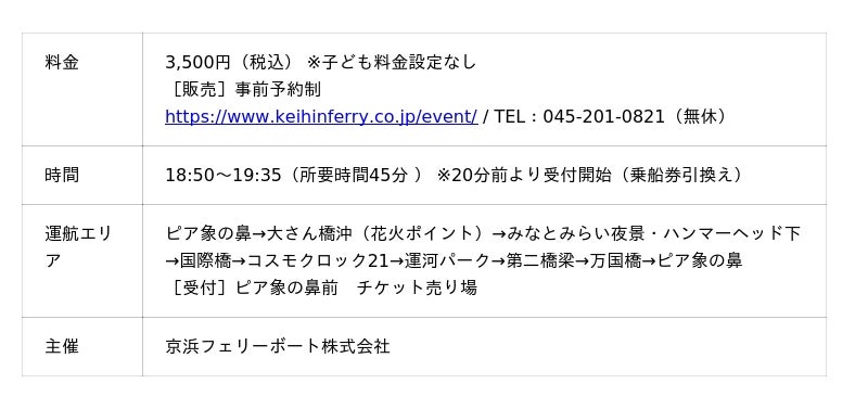 「YOKOHAMA NIGHT FLOWERS × GREEN×EXPO 2027」の打ち上げにあわせ、花で彩られた「フラワークルーズ」から、夜の横浜ベイエリアや横浜ランドマークタワー、横浜赤レンガ倉庫、大観覧車「コスモクロック21」を望む、昼間とは異なる特別な体験を提供します。夜空の花と船上の花が織りなす、横浜ならではの景観をお楽しみいただけます。 (「YOKOHAMA NIGHT FLOWERS × GREEN×EXPO 2027」公式HP:https://www.yokohama-nightflowers.com/)