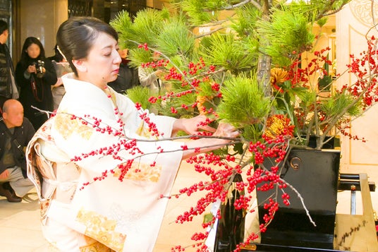 1月1日の「新春鏡開き」では、木槌の音とともに一年の無病息災を願い、振る舞い酒をご用意いたします。続く「新春初いけ式」では、華道石田流家元 石田巳賀氏が新春を象徴する花材を用い、その場で大作を仕上げる迫力のライブをご覧いただけます。