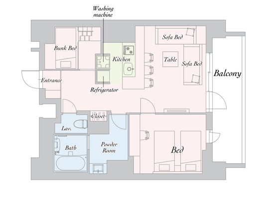 客室は全室スイートルーム仕様で、最上階客室にはプライベートサウナ付きの客室など4タイプの客室をご用意しています。客室にはキッチンや全自動洗濯機など、ファミリーや長期宿泊に対応した設備を備えています。