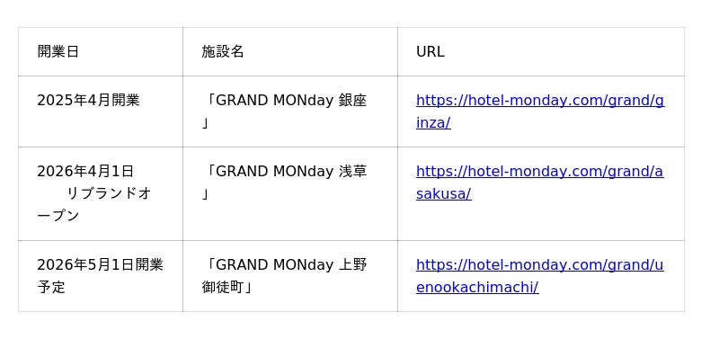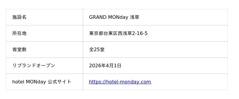 株式会社JHAT(本社:東京都港区、代表取締役社長:平林 朗)は、時代の変化や多様化するゲストのニーズに対応するため、「MONday Apart Premium 浅草」を2026年4月1日に「GRAND MONday 浅草」としてリブランドオープンします。