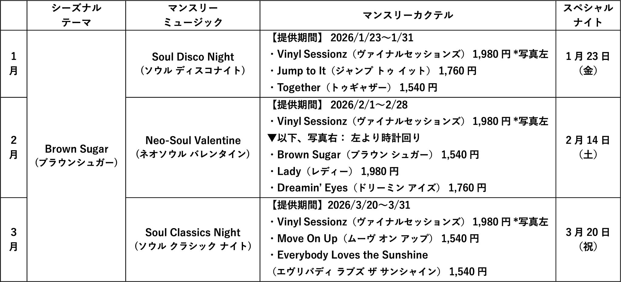 まず、3月まではネオソウルの象徴、ディアンジェロの名盤にオマージュを捧げた“Brown Sugar(ブラウンシュガー)”をテーマに、金沢を拠点に活躍するDJユニット「Vinyl Sessionz(ヴァイナルセッションズ)」が多彩な選曲を披露してまいります。1月はブラックミュージックの黄金時代とも称される1970~80年代を体感する“Soul/Disco Night(ソウルディスコナイト)”、2月はディアンジェロと同時代のアーティストの曲をセレクトした“Neo-Soul Valentine(ネオソウル バレンタイン)”、そして3月は力強く心を揺さぶるサウンドが魅力の“Soul Classics Night(ソウルクラシックナイト)”をマンスリーテーマとして、豊富なセットリストと個性あふれるオリジナルカクテルをお届けし、月1回のスペシャルナイトは1月23日(金)に初開催します。