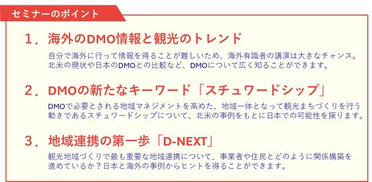 2025年10月のガイドライン改正に伴い、DMOへの関心が高まっておりますが、これからのDMOに求められる地域連携を重視した考え方「スチュワードシップ」の可能性を探る他、観光地域づくりに不可欠な地域連携に役立つ観光地域診断ツール「D-NEXT」の利用事例も取り上げます。セミナー終了後の参加者同士の交流会は、ネットワークづくりにもおすすめです。