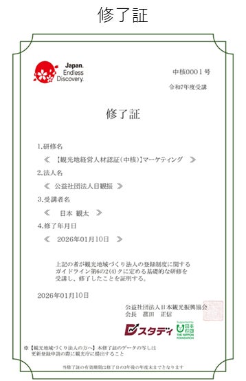 公益社団法人日本観光振興協会(東京都港区 会長 菰田正信(三井不動産(株)代表取締役会長)は、当協会が運営する観光地経営人材認証「Dスタディ」について、2025年度の修了者実績をとりまとめましたので、お知らせいたします。