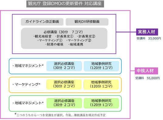 本プログラム(2025年10月6日~2026年3月31日実施)は、各DMOにおいて3名以上の受講が必須とされているDMOの更新登録要件に対応した「観光地域づくり法人の中核・実務人材向け研修」として、観光庁に選定されている研修のうちの一つです。観光地域づくりを担う人材の育成を目的に、「実務人材」および「中核人材」の2つのコースを設け、地域マネジメントやマーケティング、組織マネジメント等の実践的な内容を提供しています。