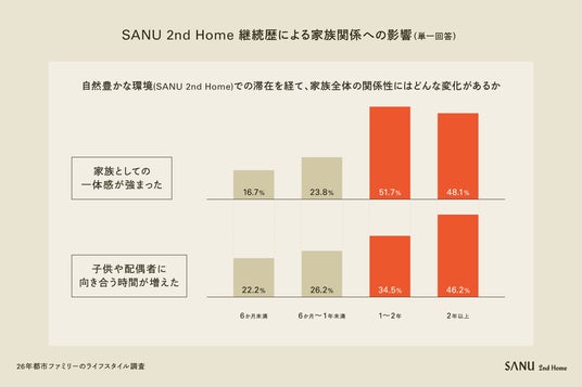 さらに、SANUを継続利用しているメンバー内での比較では、自然との往復が1年を超え、生活のなかに「通う自然」が定着した層において、家族の関係性に深い変容が確認されました。家族の一体感(51.7%)や、子供や配偶者に向き合う時間(46.2%)が高い水準となりました(図9)。ほかにも、子どもも「帰宅後も自然の話をする」割合が増えるなど、自然体験が都市の日常に変化をもたらす兆候が確認されました。