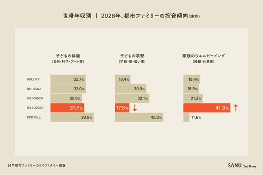 世帯年収1,500~2,000万円層では「家族のウェルビーイング(41.3%)」が「子どもの学習(17.5%)」を大きく上回り、コンディションを優先する傾向が明確に。