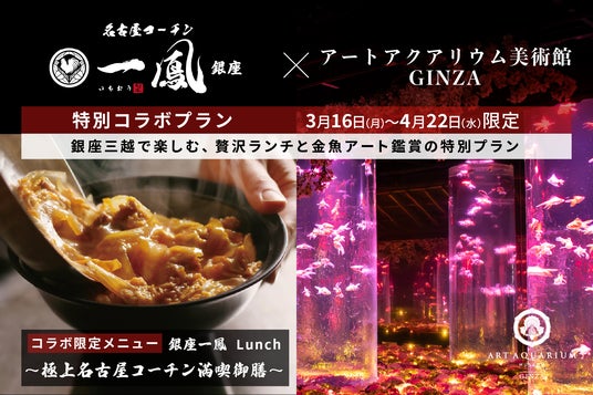 アートアクアリウム美術館 GINZA(所在地/銀座三越)では、名古屋コーチン一鳳 銀座の贅沢ランチと、アートアクアリウム美術館入場券がセットになった特別コラボプランチケットを3月16日(月)~4月22日(水)の期間限定で販売いたします。