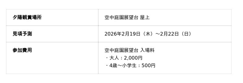 リリース内では、年間を通して撮影されたさまざまな夕景写真も紹介し、空中庭園展望台ならではの魅力をお伝えします。