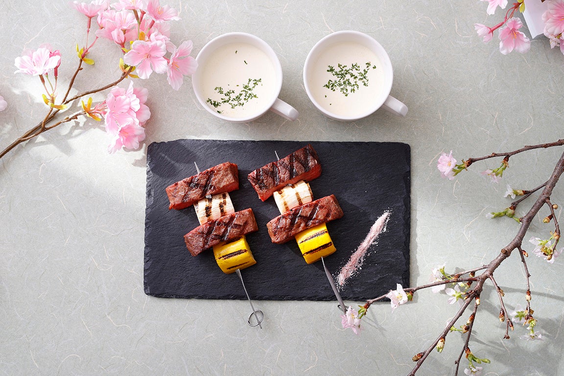 毎年ご好評を頂いている「GOTENYAMA SAKURA BOX」が、今年も咲き誇る御殿山の桜とともに登場します。和モダンな三段のお重には、ハマグリのマリニエールや鮮やかなパプリカピューレの赤色が目をひく帆立のマリネなどの海の幸。さらに、いちごをふんだんに使用したタルトやジュレなどのデザートが並び、見た目も味わいも春を感じる華やかなお花見弁当に仕上げました。また、三段のお重のほかにもメインディッシュとして和牛と旬の野菜のグリルをミニブロシェットスタイルで堪能する特別感あふれる一品もご用意いたします。