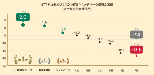 NTTドコモビジネスX株式会社(旧:NTTコムオンライン、本社:東京都品川区、代表取締役社長:稲葉 秀司、以下NTTドコモビジネスX)は、総合型旅行会社を対象にNPSベンチマーク調査2025を実施しました。この結果、最もNPSが高いのはJR東海ツアーズとなりました。