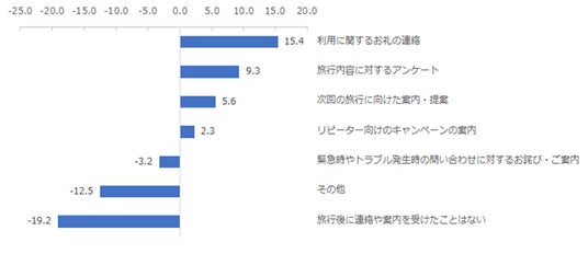 旅行後に受けとった連絡の経験別にNPSも分析したところ、旅行後にいずれかの連絡や案内を受けたことがある人のNPSは、連絡を受けたことがない人に比べて高くなりました。また、受け取った内容別では「利用に関するお礼の連絡」を受け取った人のNPSが最も高く15.4と高くなり、旅行後も利用者にお礼の連絡などのコミュニケーションをとっていくことの重要性がうかがえる結果となりました。