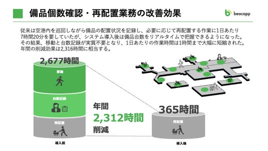 Beacapp Tagの導入により、歩行補助具それぞれの現在地と保管場所ごとの配置数を、スタッフがiPadでリアルタイムに把握できるようになり、これまで1日平均7時間20分かかっていた備品の確認・再配置作業は、1日平均1時間まで大幅に削減されました※2。これは月間では約193時間、年間約2,312時間分に相当します。この新たに捻出した業務時間を、ロビーやゲートでの対応など、直接お客様と向き合う業務に振り向けられるようになりました。