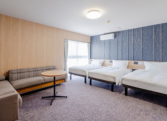 客室は「たびのホテル」ブランドの特長である、お客様視点での快適性を追求し、寝心地の良いベッドマットレスをはじめ、使い勝手に配慮したソファやテーブル、2ドア冷蔵庫、電子レンジ、さらには高画質のスマートテレビを完備しました。お部屋タイプもトリプルやフォースなどご家族やグループでもゆったりとお過ごしいただける多彩な客室をご用意いたしました。