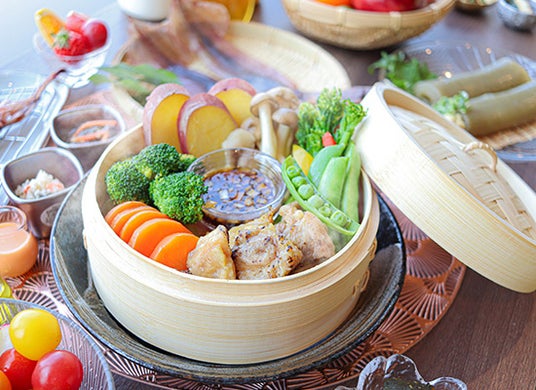島の恵みを凝縮、島野菜と鶏のセイロ蒸し