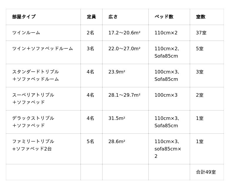全49室の客室は、ツインルームを中心に、最大5名まで宿泊可能なトリプル、フォース、フィフスルームなど、グループや家族旅行にも最適なお部屋タイプをご用意しています。レジャーはもちろん、スポーツ団体や教育旅行、企業研修など、大人数でのご滞在にも柔軟に対応いたします。
