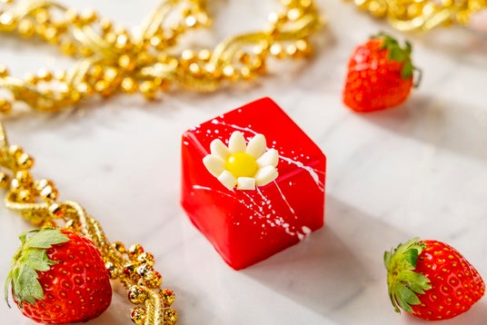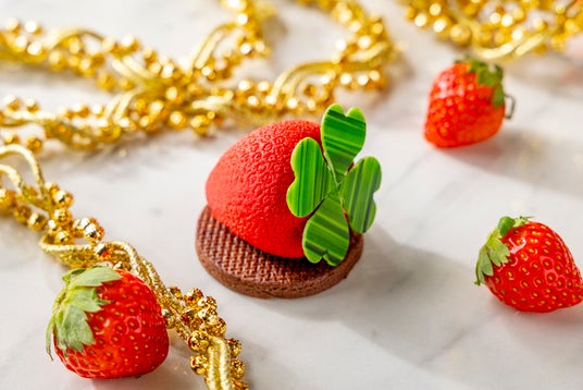 いちご形の可愛いムースの中に、オレンジフラワーを閉じ込めました。苺のヘタをクローバーの形に見立て、幸運を感じさせる遊び心をプラス。