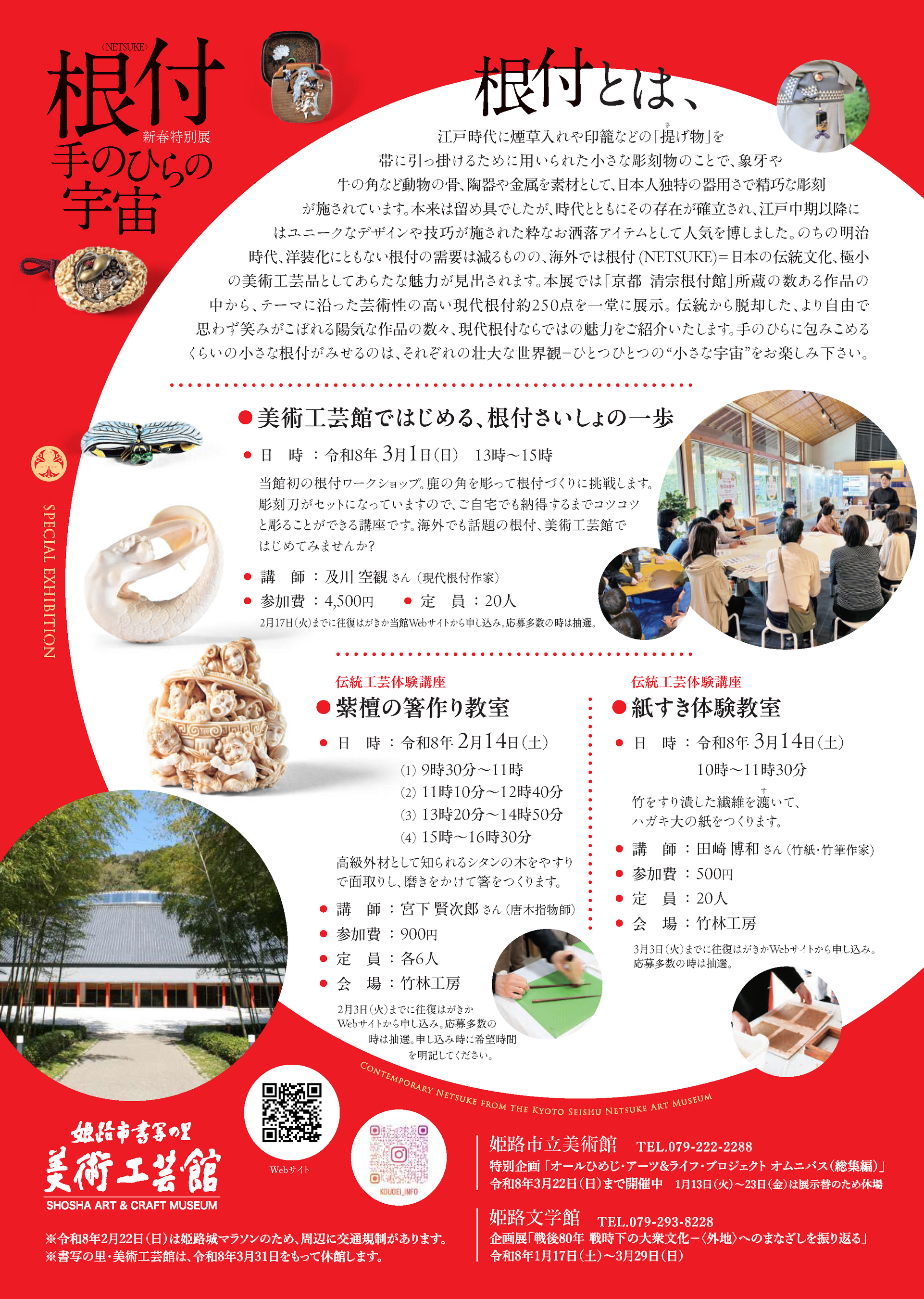 姫路市書写の里・美術工芸館では、令和8年1月6日(火曜日)から3月31日(火曜日)まで新春特別展「根付<NETSUKE>-手のひらの宇宙」を開催します。