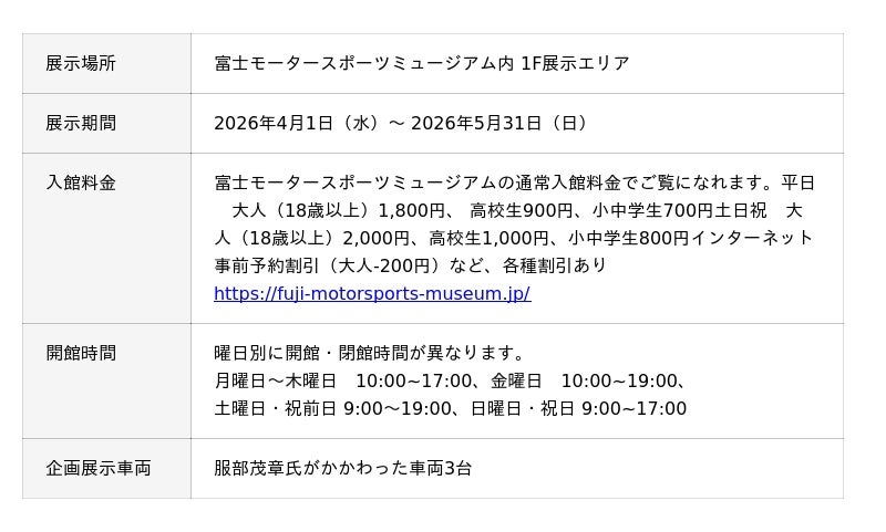 富士モータースポーツミュージアムは、日本人として米国トップカテゴリーで道を切り開き、NASCARチームオーナーとしても活躍したレーシングドライバー、服部茂章氏(2025年4月逝去)の足跡をたどる企画展「服部茂章メモリアル展」を2026年4月1日から開催します。
