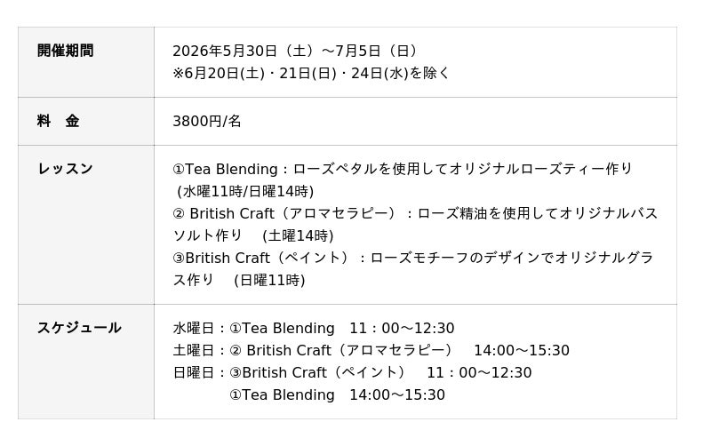 英国の伝統文化を体験できる「英語カルチャーレッスン」を期間限定でローズ仕様になります。レッスンで作った作品はお土産にお持ち帰りいただけます。